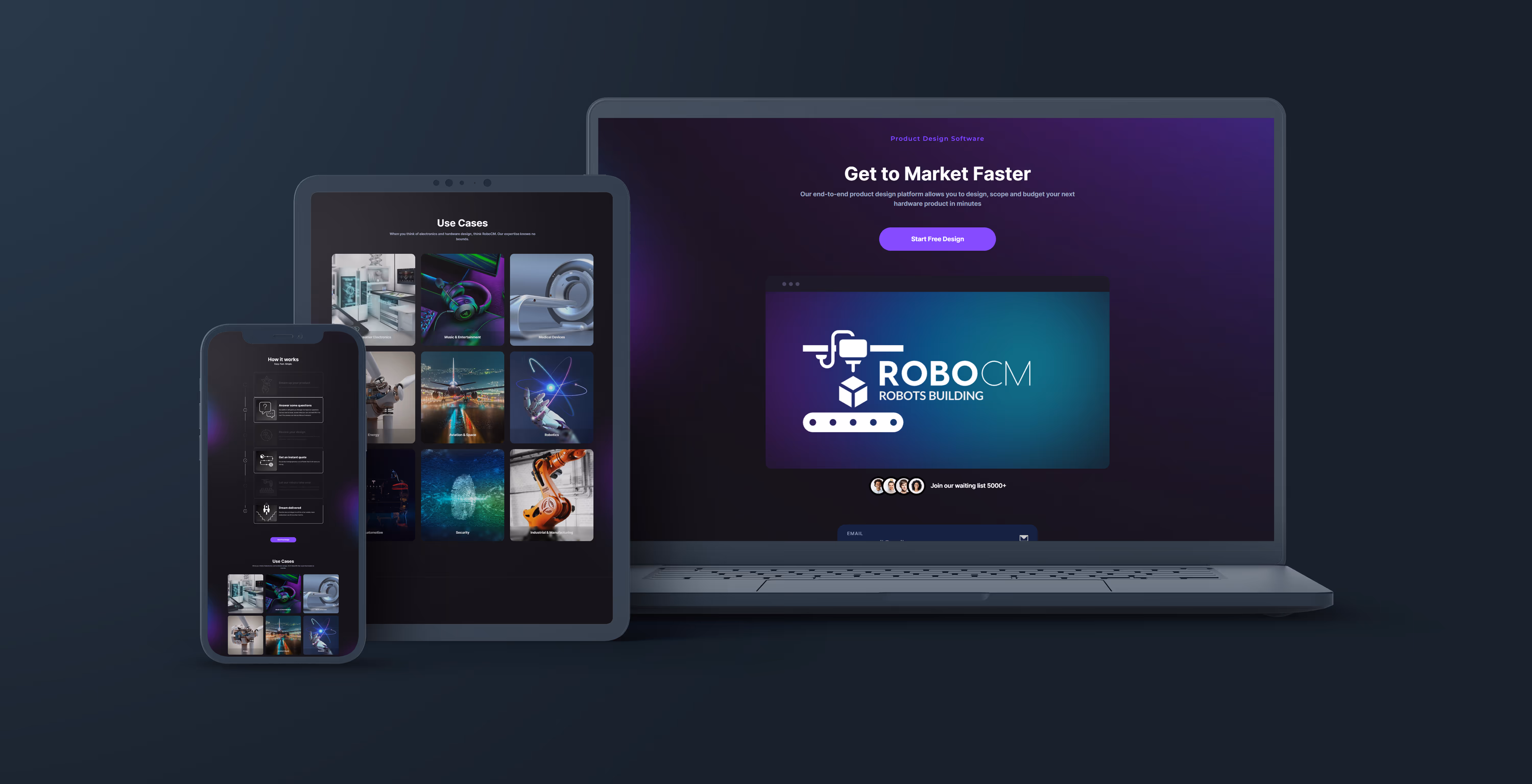 The mission was to craft an engaging website for RoboCM, spotlighting its stress-reducing hardware design platform. Emphasizing user-friendliness, the site aimed to communicate the company's commitment to streamlining the hardware design process. We strived to create a digital gateway that effectively conveyed RoboCM's mission, technology, and advantages.